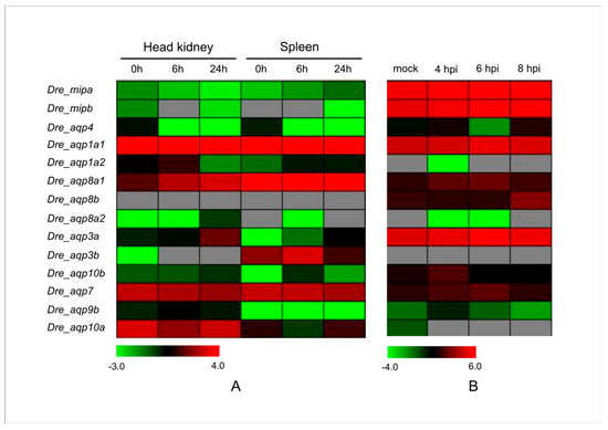 SVCV causes highly infectious viremia associated with hemorrhagic symptoms in fish [74]. An SVCV infection is highly lethal in young fish with mortality rates up to 90%, which causes huge economic losses to the aquaculture industry [75]. Mycobacterium marinum is a well-known pathogenic mycobacterium of skin and soft tissue infections of fish [76]. After exposure to an infected aquatic environment or animals, this pathogen can also infect humans and cause a red or tan skin bump called an aquarium granuloma [77]. To determine whether zebrafish Aqps are involved in the response to these biotic stressors, we further analyzed their expression patterns under SVCV and M. marinum infection stress via microarray and RNA-Seq data [56,57]. The results indicated that the expression levels of four Aqp genes were enhanced in the spleen post-SVCV infection (Figure 5). More than half of the analyzed zebrafish Aqp genes showed a higher expression level in the head kidney under the same stress. In addition, the Dre_aqp3a and the Dre_aqp10b transcripts increased in both SVCV infected test tissues, implying that these genes may be associated with the pathogenic response. Expression levels of more than 57% of the detected Aqp genes were increased after the M. marinum infection, and this trend was particularly evident 4 h post-injection (hpi) (Figure 5). Interestingly, Dre_aqp8a1, Dre_aqp3a, Dre_aqp10b, Dre_aqp7, and Dre_aqp9b genes were significantly upregulated in SVCV and M. marinum infected tissues, implying that these genes may be associated with the response to these biotic stressors. In addition, functional divergence of duplicated genes was also investigated. Three pairs of duplicated Aqp genes (Dre_aqp1a1/Dre_aqp1a1; Dre_aqp8a2/Dre_aqp8b; and Dre_aqp3a/Dre_aqp3b) (Table S1) showed different expression patterns under these stressors. For example, M. marinum infection induced expression of the Dre_aqp8b gene but decreased the transcript level of the Dre_aqp8a2 gene. Taken together, these findings suggest that functional divergence has occurred among these duplicated genes, and that their products may play different roles in specific stress responses.