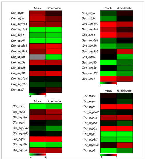 To verify whether fish Aqp genes are also affected by organophosphorus pesticides, we first investigated their expression patterns under dimethoate (an organophosphorus pesticide) stress using transcriptome sequencing in four fish species, including D. revio, O. latipes, G. aculeatus, and T. rubripe. Our results indicated that expression levels of about 43.75% of the Aqp genes increased under dimethoate stress (Figure 6). Among them, expression levels of the Gac_aqp8a2 and the Gac_aqp10b genes increased 9.7 and 7.7 times under dimethoate treatment, respectively, compared with the mock group. However, the expression level of the Dre_mipb gene decreased about 4.2 times under the same conditions. The response of some duplicated Aqp genes (such as Dre_aqp1a1/Dre_aqp1a2, Gac_aqp9/Gac_aqp9b, and Ola_mipa/Ola_mipb) (Table S1) to dimethoate treatment was also significantly different (Figure 6). As a group of water channel proteins, Aqps are involved in many physiological functions and pathological processes, such as transepithelial transport [78], tumorigenesis [79], cell migration [80], and neuronal signal transduction [81]. Furthermore, organophosphorus pesticides have been demonstrated to affect immunoregulation in fish [82]. Here, the expression levels of some fish Aqp genes were induced under dimethoate stress, suggesting that these Aqps may be involved in fish immunoregulation.