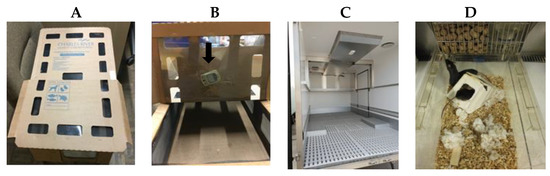 (A) Transport crate; (B) data logger inside of crate (arrow); (C) inside of truck; (D) holding cage with enrichment.