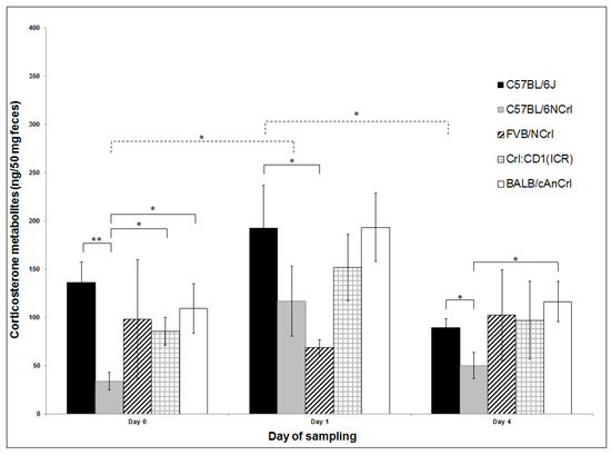 Levels of corticosterone metabolites (ng/50 mg of feces) are shown in Figure 2. The two-way ANOVA of FCM concentrations revealed significant differences between days (p = 0.0138) and genetic backgrounds (p = 0.0259). FCM levels increased from Day 0 to Day 1 and decreased on Day 4 in all genetic backgrounds except in FVB/N, where values were lowest on Day 1 (68.7 ± 8.4 ng/50 mg of feces). However, significant higher FCM levels on Day 1 compared to Day 0 were observed only in the B6N strain. Compared to Day 4, FCM levels in the B6J strain were significantly higher on Day 1. Among genetic backgrounds, on Day 0, levels were significantly lower in B6N (34 ± 9.1 ng/50 mg) compared to B6J (136.2 ± 21.1 ng/50 mg), CD-1 (85.5 ± 14.4 ng/50 mg), and BALB/cN (109.3 ± 25.6 ng/50 mg). Significantly lower levels were observed for FVB/N (68.7 ± 8.4 ng/50 mg) compared to B6J (192.7 ± 44.6 ng/50 mg) on Day 1, and for B6N (50.3 ± 13.4 ng/50 mg) compared to B6J (89.7 ± 8.9 ng/50 mg) and BALBc/N (116.6 ± 21.1 ng/50 mg) on Day 4.