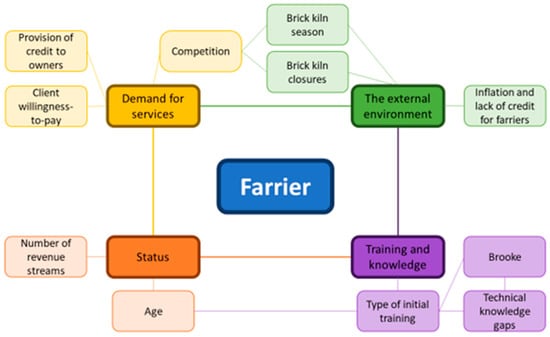 A conceptual framework depicting the key themes that farriers used to describe the factors influencing their work.