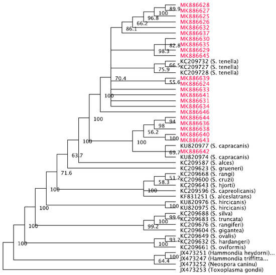 - Gjerde, B. Phylogenetic relationships among Sarcocystis species in cervids, cattle and sheep inferred from the mitochondrial cytochrome c oxidase subunit I gene. Int. J. Parasitol. 2013, 43, 579–591. [Google Scholar] [CrossRef]