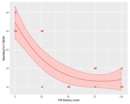 Mortality as a function of dietary insect meal (YM) levels.