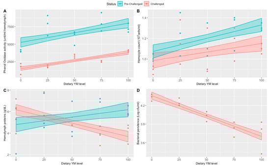 Similarly, the fitted model for hemolymph protein showed an interaction (p = 2.2 × 10−5), which indicated two different linear trends in the data; positive and negative trends between hemolymph protein and dietary YM level for pre-challenged and challenged shrimp, respectively (Figure 2C and Table 5).