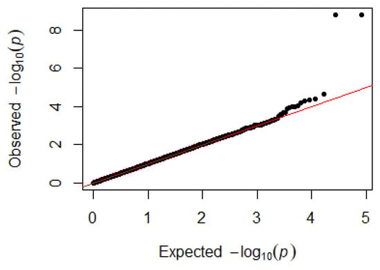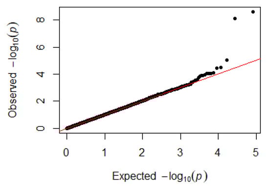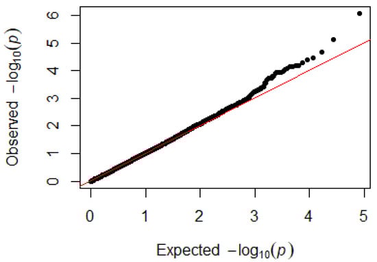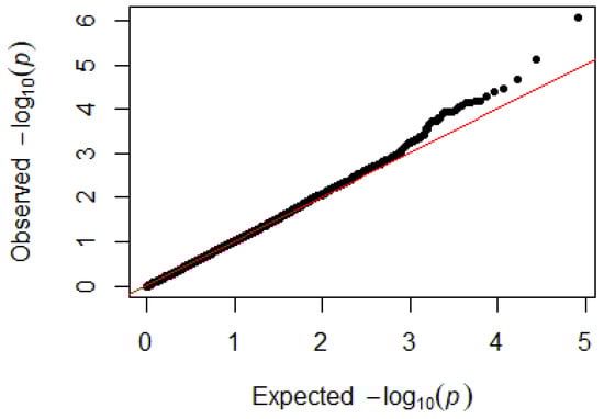 Since GEMMA (v. 0.98, University of Michigan, Ann Arbor, Michigan, USA) is based on the hybrid model and cannot avoid the group stratification problem, it is necessary to conduct stratified tests on the test population. Q–Q plots performed on the three traits indicated that the χ2 distribution calculated by SNP correlation analysis did not deviate from the null hypothesis test distribution. The χ2 value of the significant SNP locus observations is above the expected χ2 value. This showed that there was no group stratification in the population under study and that the correlation analysis results of this analytical method were reliable (Figure 1, Figure 2, Figure 3 and Figure 4).