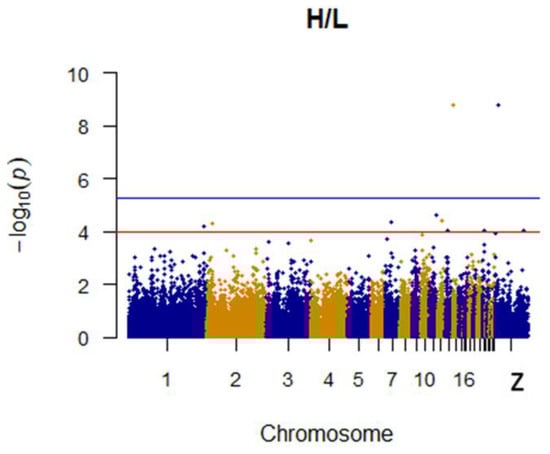 Manhattan plot for H/L in chicken. The x-axis is the position of each single nucleotide polymorphism (SNP) on the chicken chromosomes 1–28 and linkage group and the y-axis is the −log10 p-value.