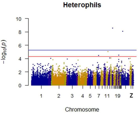 Manhattan plot for heterophils in chicken. The x-axis is the position of each single nucleotide polymorphism (SNP) on the chicken chromosomes 1–28 and linkage group and the y-axis is the −log10 p-value.