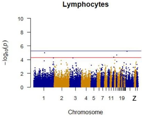 Manhattan plot for lymphocytes in chicken. The x-axis is the position of each single nucleotide polymorphism (SNP) on the chicken chromosomes 1–28 and linkage group and the y-axis is the −log10 p-value.