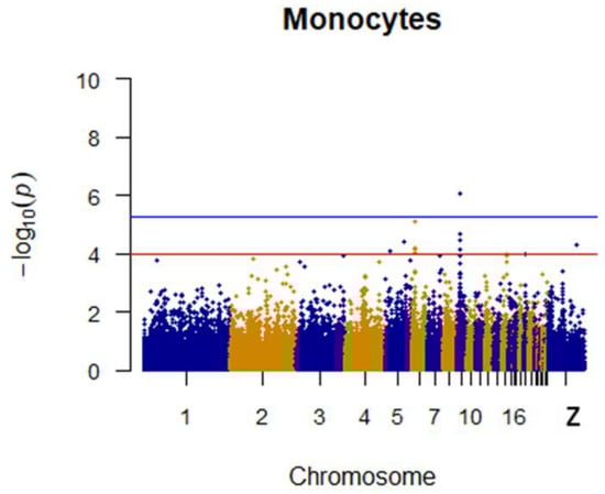 Manhattan plot for monocytes in chicken. The x-axis is the position of each single nucleotide polymorphism (SNP) on the chicken chromosomes 1–28 and linkage group and the y-axis is the −log10 p-value.
