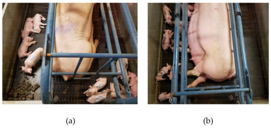 Control (CON) litters (n = 4) had free access to maternal feces, and experimental group litters (deprived group; n = 4) were deprived (DEP) of maternal feces from birth until 7 d of age. Fecal deprivation was until 7 d of age since piglets will show signs of anemia at this point in time if no extraneous iron had been provided. Ten days before the expected farrowing day, sows were moved to individual farrowing crates. Until farrowing, all crates were washed daily with water to remove maternal feces. From farrowing until 7 d of age, an observer was on the farm 24 h/d weighing maternal feces immediately after defecation to determine sow fecal output and removing maternal feces from the pens of DEP litters. After being weighed by the observer, maternal feces of CON litters were placed over a rubber pad in a corner of the pen to prevent sows from blocking piglet access to feces, as well as to prevent feces from falling into the pit (Figure 1). Fecal samples (5 g) from all sows were collected once a day (at 6 a.m.) and pooled for the duration of the study, oven dried at 55 °C for 48 h, and used for determination of the nutrient contents. Dietary and fecal sample nutrient analyses were performed at the Dairy One, Inc. laboratory (Ithaca, NY). Fecal true protein (TP) concentration was measured using the bicinchoninic acid (BCA) assay kit (Thermo Fisher Scientific, Bellefonte, PA) according to the manufacturer’s instructions. After 7 d of age, piglets in both treatment groups had free access to maternal feces. Piglets were ear notched, teeth clipped, injected with iron dextran and penicillin, and then castrated (males only) at 7 d of age.
