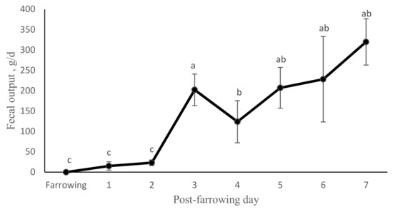 Fecal output (DM basis) ± standard errors (SE) of sows (n = 8) after farrowing. The data presented are least square means ± SE and represent the best estimate of means that was obtained using repeated measurements. Days with different superscripts are significantly different from each other based on Friedman test (p < 0.05).