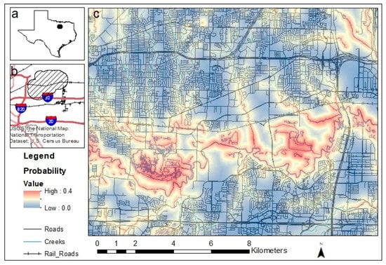 (a) Location of the Dallas–Fort Worth (DFW) metroplex, Texas, USA; (b) specific study site (hashed polygon) within the DFW metroplex; and (c) heat map from the resource selection function model created using data from GPS-collared bobcats in the study site. The Trinity River runs east–west through the south-end of the study area.