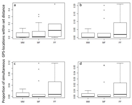 Proportion of simultaneous GPS locations for male–male (MM), male–female (MF), and female–female (FF) bobcats that were simultaneously within (a) 1000, (b) 700, (c) 500, or (d) 300 m of one another.