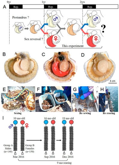 In March 2016, 10-month-old farmed Yesso scallops (M. yessoensis) were purchased (approximately 300 scallops) from a local commercial supplier (Ogatsu Bay, Miyagi, Japan). This population in Miyagi Prefecture already undergoes sex differentiation to female or male at 10 months of age (Figure 1A). This scallop species has a clear reproductive period in spring, as described elsewhere [11]. During this reproductive period, the gonads exhibit a sex-specific color (i.e., milky white color for testis in males, as shown in Figure 1B, orange-red color for ovary in females, as shown in Figure 1C). Meanwhile, in summer, male and female gonads exhibit the same color (i.e., beige color for both sexes) during the spent stage (Figure 1D) and are not distinguishable histologically. For the tracking experiment, sexing was performed for all individuals in March 2016 (10 months of age) by visual judgment of gonad color on shore (Figure 1E). If there was uncertainty about the sex, we discarded the scallops (n < 5). In total, male (n = 140) and female scallops (n = 150) were identified, divided into two groups (Figure 1F), hanged on a nylon rope each a plastic pin (Figure 1G,H), and used for the subsequent rearing study as group A (pro-male population) and group B (pro-female population). Both groups were separately hanged on ropes and re-reared for extra nine months until the next reproductive period (Figure 1I, Table 1). Sampling for sexing in the subsequent reproductive period was performed in October (16 months of age) and December 2016 (19 months of age). For all specimens sampled, shell length (SL) and softbody weight (BW) were measured. Then, the softbody and gonad were dissected, weighed for calculation of gonad index (GI; 100 × gonad weight/softbody weight (%)), and sampled for fixation for sexing by subsequent histological analysis. The sampled gonads were fixed with Davidson’s solution (artificial sea water/glycerin/formalin/ethanol/acetic acid, 3:1:2:3:1, v/v) at 4 °C for 24 h, rinsed with distilled water, dehydrated with an ascending ethanol series, and then embedded in paraffin. Cross sections, 6 μm-thick, were prepared, attached onto glass slides (Matsunami Glass, Tokyo, Japan), and used for hematoxylin and eosin (HE) (Muto Pure Chemicals, Tokyo, Japan) staining. Histological observation was performed for the specimens sampled in October and December in 2016. Because, in October, the gonad color was at the beginning of the reproductive period and still faint, we carefully evaluated the sex by histological observation.