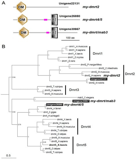 Domain analysis and phylogenic tree of my-dmrts. (A) Domain structure analysis of my-dmrts by SMART. The Doublesex/Mab-3 (DM) and DMRTA-specific C-terminal (DMA) domains are indicated. The scale bar represents a length of 100 amino acids. (B) The numbers at the nodes indicate Bayesian posterior probability. The scale bar indicates amino acid substitutions per site. GenBank accession numbers for the sequences are listed in Table S1.