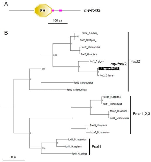 Domain analysis and phylogenic tree of my-foxl2. (A) Domain structure analysis of my-foxl2 by SMART. The forkhead (FH) domain is indicated. The scale bar represents a length of 100 amino acids. (B) The numbers at the nodes indicate Bayesian posterior probability. The scale bar indicates amino acid substitutions per site. GenBank accession numbers for the sequences are listed in Table S2.