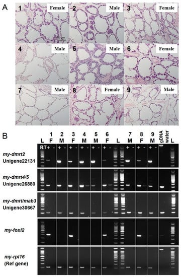 Sex-specific mRNA expression of my-dmrts and my-foxl2 in the gonads was subjected to RT-PCR analysis with testis and ovary cDNAs of adult scallops. To evaluate sex identification markers, we chose gonads at the early differentiating stage as specimens, because their sex could not be distinguished by visual judgment of gonad color (data not shown). For the nine Yesso scallops, histological observation of the gonads was first performed to carefully distinguish their sex (Figure 5A). Then, RT-PCR screening for my-dmrts and my-foxl2 candidates was performed (Figure 5B). For three my-dmrts, Unigene22131 (my-dmrt2) showed dominant expression in the testes rather than in the ovaries. Two other dmrts (i.e., Unigene26880 (my-dmrt4/5) and Unigene30667 (my-dmrt/mab3)) showed uniform expression in testes and ovaries. In addition, Unigene30321 (my-foxl2) was specifically expressed in the ovaries, showing no mRNA expression in the testes.