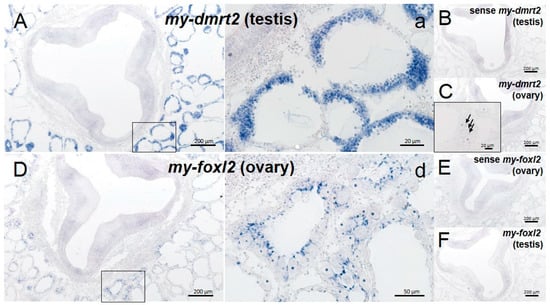ISH detection supported the sex-specific expression of my-dmrt2 and my-foxl2 for testis and ovary, respectively. At the early differentiating stage, the testes were filled with proliferating spermatogonia, whereas the ovaries were filled with growing primary oocytes and fewer oogonia (Figure 6). As a testis/male-specific marker, my-dmrt2 mRNA was detected in spermatogonia in the testis (Figure 6A-a), while its faint signals were seen in some ovarian cells (inset in Figure 6C). Regarding ovary/female-specific markers, my-foxl2 mRNA was detected in follicle cells attached to growing oocytes in the ovary, and its expression was absent in testicular cells (Figure 6D-d,F). In addition, no signal was observed in sense probe conditions for my-dmrt2 and my-foxl2 in both testis and ovary (Figure 6B,E).