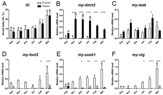 During the reproductive cycle, the mRNA expression of my-dmrt2, my-foxl2, my-soxb1, my-tesk, and my-vtg in testes and ovaries was quantified by real-time qPCR (Figure 7). The maturation stages were defined by GI (GI in Figure 7A) as follows: September (early sex differentiation), November (growing), December (early mature), January (middle mature), February (fully mature), and March (fully mature and spawning), as reported elsewhere [11]. my-dmrt2 was consistently expressed at a higher level in testes than in ovaries throughout the reproductive cycle (Figure 7B). The mRNA expression of my-dmrt2 in testes drastically increased in November after gonad sex differentiation in September. The mRNA expression of my-dmrt2 gradually decreased until the fully mature stage in March. The mRNA expression of my-tesk showed no sex-biased pattern throughout the reproductive cycle (Figure 7C). In detail, my-tesk mRNA was expressed at a higher level in testes in November and February, whereas no different levels of mRNA were observed in ovaries. In contrast, my-foxl2 mRNA was expressed at a higher level in ovaries for all maturational stages, while a much lower expression was seen in testes (Figure 7D). Fully mature ovaries in March showed the highest mRNA expression of my-foxl2 throughout the reproductive cycle. The mRNA expression of my-soxb1 was ovary-dominant during maturation (Figure 7E), similar to the mRNA expression of my-foxl2, gradually increased until the fully mature stage in March, according to gonad maturation, and showed the highest level in fully mature ovaries in March. my-vtg mRNA was dominantly expressed in ovaries, where its expression level gradually increased according to gonad maturation, peaking in fully mature ovaries in March (Figure 7F). No expression of my-vtg mRNA was observed in testes throughout the reproductive cycle.