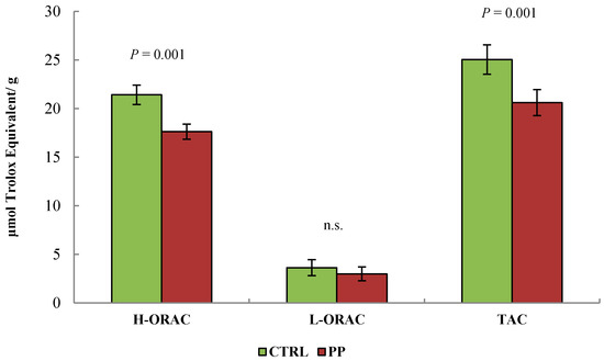 Effect of the inclusion of pomegranate pulp in the diet of lactating ewes on the antioxidant capacity of milk expressed as (μM Trolox Equivalent/g). CTRL = control concentrate, PP = concentrate containing 64% pomegranate pulp, H-ORAC = antioxidant capacity of milk hydrophilic fraction, L-ORAC = antioxidant capacity of milk lipophilic fraction, TAC = total antioxidant capacity of milk (H-ORAC + L-ORAC).
