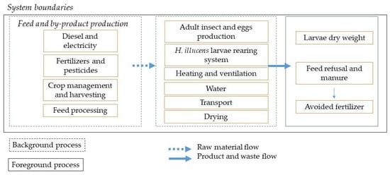 The system boundaries (Figure 1) included the development of BSF from eggs to prepupae. Energy, transport, water, and substrate production were considered. Larvae manure and feed residues obtained after separation of larvae from the rearing substrate were analysed for N, K, and P composition. For the N analysis method, 984.13 [] was applied. The total P and K contents were determined by inductively coupled plasma mass spectrometry (Varian, Fort Collins, CO, USA), preceded by acid digestion [] of the samples. Manure was considered to be avoided fertilizer in the environmental impact calculation.