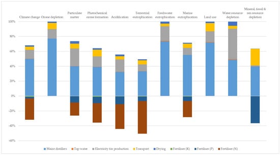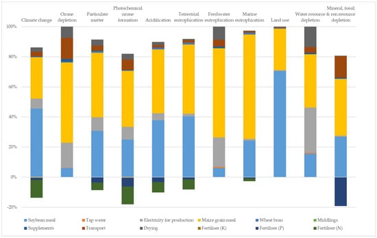 Figure 2 and Figure 3 show the weight of the different processes that contributed to the environmental impact of larvae production expressed as one kilogram of dry larvae. The results are reported only for the hen diet and maize distiller systems, because, unlike the other two systems, in these systems, an environmental weight has been assigned to the substrate used.