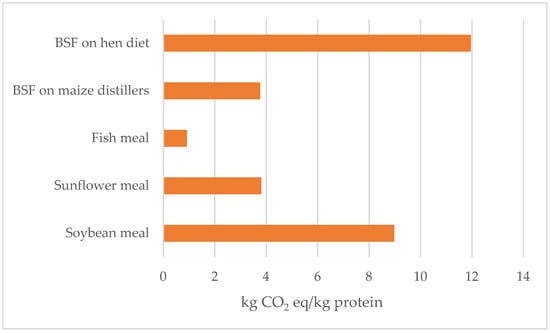 Considering that all over the world larvae production is now studied as an alternative feed and/or food, it is useful to evaluate the environmental impact of using it as a functional unit protein and for its fat content. Figure 4 compares climate change for the production of 1 kg of protein derived from (1) BSF larvae grown on the experimental substrates, (2) fish meal, and (3) two vegetable feed sources (sunflower and soybean meal). Sunflower and soybean meal are two by-products largely used as feed in animal production systems (both monogastrics and ruminants), due to their high crude protein content; their environmental impact is allocated between oil and meal, usually following an economic allocation.