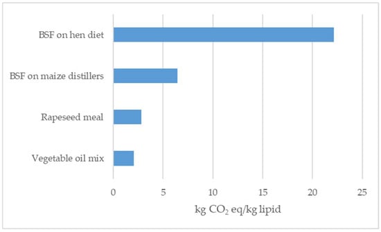 In the present study, climate change and marine eutrophication (per kg of lipid) was higher when using insects grown on hen diet than rapeseed meal (0.145 vs 0.035 kg N eq for BSF on hen diet and rapeseed meal for marine eutrophication, respectively), while marine eutrophication produced by BSF grown on maize distiller was the lowest (0.008 kg N eq). Significant benefits were found to be connected to acidification using BSF grown on the maize distiller as a source of lipids (0.015; 0.036; 0.008; 0.19 molc H+ eq, respectively, for the vegetable oil mix, rapeseed meal, BSF on maize distillers, and BSF on the hen diet).