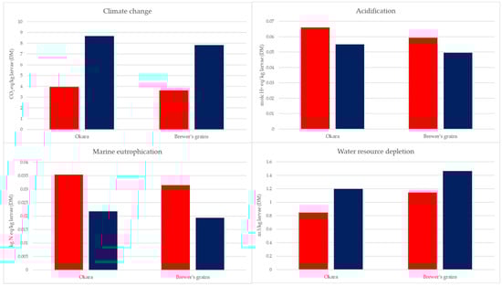 Moreover, the results obtained from the sensitivity analysis, compared to the previous results, showed that the environmental impact and, in particular, the climate change of the larvae grown on okara and brewer’s grain (as substitutions for soybean meal) was higher than the impact of larvae grown on a hen diet and maize distillers. Similar or lower results were obtained for BSF on the two by-products (in each substitution) for marine eutrophication and water resource depletion.