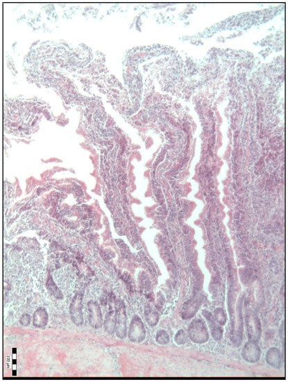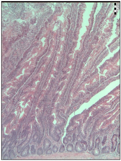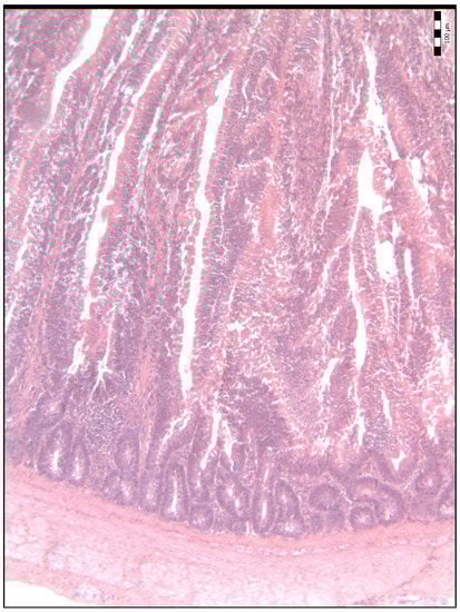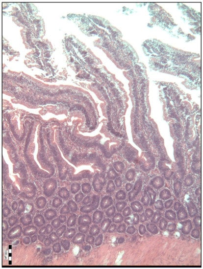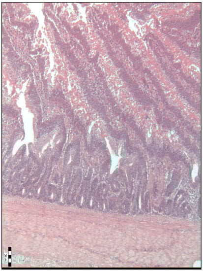 Previous studies have already confirmed that longer intestinal villi indicate an improved ability to absorb nutrients in the intestine [,]. In addition, it has been proven that longer villi are associated with active cell mitosis, which provides a greater absorptive potential of villi for various nutrients [,]. Deeper intestinal villi crypts indicate a rapid metabolism of tissue in order to allow the renewal of the intestinal villi, if there is a need for its regeneration []. Lowering the height of the villi or reducing crypt depths of intestinal villi may lead to a reduction in the absorption of nutrients [].