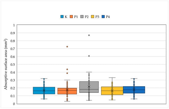 The average absorptive surface area of duodenal villi according to the group of broiler chickens on the 42nd day of the feeding trial (Kruskal–Wallis test, p < 0.001).