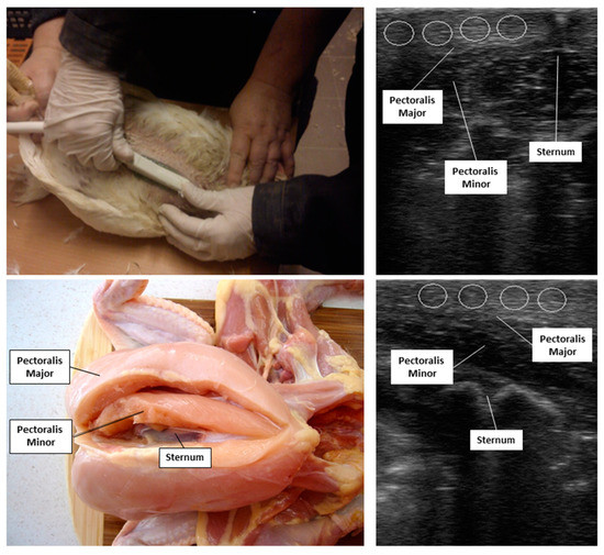 In situ ultrasonographic examinations (upper left) of pectoralis major muscles (bottom left—https://kriegerscience.wordpress.com/2010/11/09/dissecting-a-whole-chicken/) in broiler chickens (n = 40) scanned in a transverse (upper right) or longitudinal (bottom right) plane: The white circles in the panels depicting ultrasonograms indicate the potential placement of four computer-generated circular areas of interest (spot meters) used for echotextural analyses of the muscle tissue.