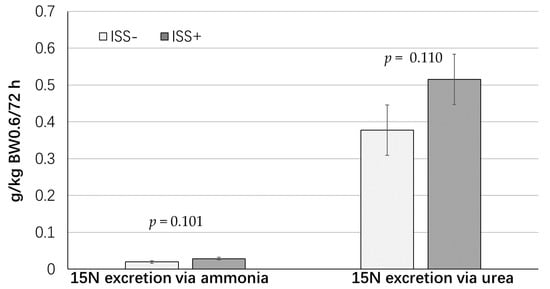 The measures of whole-body N metabolism in ISS- and ISS+ groups are presented in Table 2. Final BW was lower in the ISS+ group compared to the ISS− pigs (p < 0.018). As anticipated, ISS+ pigs had a lower dietary N intake relative to ISS− pigs (p < 0.001). However, no differences between ISS groups were observed for urinary N excretion (p = 0.45), N excretion via urinary ammonia (p = 0.81), or N excretion via urinary urea (p = 0.413). Excretion of 15N via urea was not affected by ISS at the end of the 72-h collection period (p = 0.110). However, a tendency for higher 15N excretion via ammonia was observed in ISS+ pigs compared to ISS− pigs (p = 0.101; Figure 1). As anticipated, whole-body N flux, protein synthesis and protein degradation (g N/kg BW0.60/day), as well as protein retention and N-balance, were lower in the ISS+ group compared to ISS− pigs (p < 0.001). The nitrogen retention-to-N intake ratio (N-Retention: N-Intake) was 51% lower in the ISS+ group compared to ISS− pigs (p < 0.033). Also, a strong tendency was observed for a lower protein synthesis-to-degradation ratio in ISS+ pigs compared to ISS− pigs (S:D; p = 0.065). In addition, the protein synthesis-to-retention ratio, a measure of the efficiency of PD, tended to be higher in ISS+ pigs than in ISS- pigs (S:R; p = 0.055).