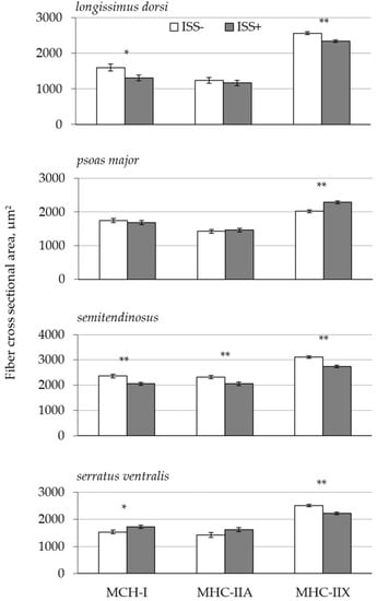 Data on nuclei density and muscle fiber type distribution in the LD, PM, ST, and SV are presented in Table 3. An interaction effect between health status and the muscle sampled (ISS × MS) was observed for nuclei density (p < 0.001). In the PM, ISS significantly reduced the density of nuclei (p < 0.001), but had no effect on this parameter in other muscle types. An interaction effect between ISS and MS was also observed for the percentage of MHC-I and MHC-IIX fiber types (p < 0.050), but not for MHC-IIA fibers (p = 0.164). Relative to ISS− pigs, ISS+ pigs had a higher percentage of MHC-I in the LD and SV (p < 0.01), while the MHC-I percentage was not affected in the PM (p > 0.200). Similarly, ISS reduced the percentage of MHC-IIX fibers in the LD and SV muscles (p < 0.020), but had no effect on this muscle fiber type in the PM and ST (p > 0.530). The percentage of MHC-IIA fibers was reduced in the ST (p < 0.050) and tended to be reduced in the PM (p = 0.089) of ISS+ pigs relative to ISS− pigs, while it was not affected in the LD and SV (p > 0.800). The MHC-IIB fiber type was only detected in the SV and LD muscles of two pigs in the ISS− group. Figure 2 demonstrates the effects of treatments on CSAF. The effects of ISS on CSAF varied among the different muscles sampled, leading to a significant interaction between ISS, MS, and fiber type for fiber cross-sectional area (p < 0.001). Immune system stimulation reduced CSAF of MHC-I fibers in the LD and ST (p < 0.050), but increased the MHC-I CSAF in the SV (p < 0.050). Immune system stimulation reduced MHC-IIX CSAF in the LD, ST, and SV (p < 0.050), but increased it in the PM (p < 0.001). Lastly, ISS significantly reduced the MHC-IIA CSAF in the ST (p < 0.001), but had no effect in the LD, PM and SV.