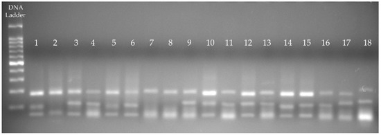 Banding patterns were analyzed and observed through electrophoresis in agarose gel (3%) in TAE 1× buffer (120 min, 70 volts), and a molecular weight marker of 100 bp (Promega, Madison, WI, USA) and Blue/Orange 6× loading buffer (Promega, Madison, WI, USA). Gels were posteriorly visualized with a UV digital photodocumentation system Gel Doc XR+ (Bio-Rad Laboratories). Assemblage typing and subtyping was performed according to that described previously by Rodríguez et al. [30].