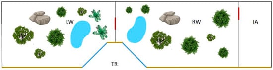 Simplified map of the wolf exhibit. LW = left wing, RW = right wing, IA = isolation area, TR = trapezoidal recess. Red lines = sliding doors, blue lines = windows, yellow lines = wooden palisade.