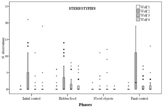 Number of times stereotypic behaviour was observed for each wolf across the four experimental phases.