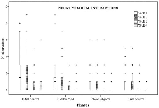 Number of times negative social interactions were observed for each wolf across the four experimental phases.