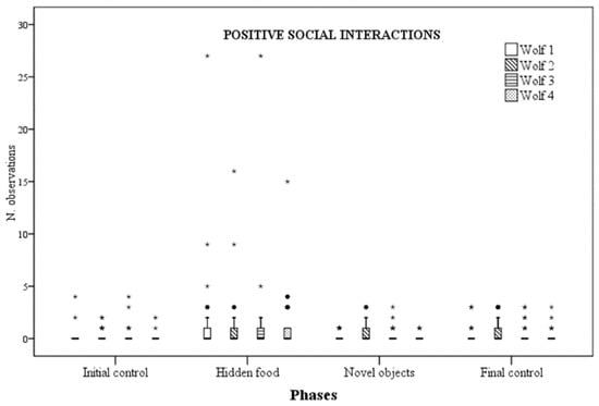 Number of times positive social interactions were observed for each wolf across the four experimental phases.