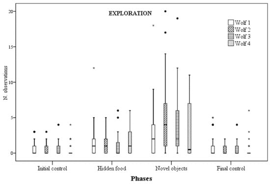 Number of times exploratory behaviour was observed for each wolf across the four experimental phases.