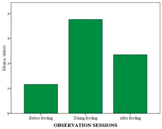 Time spent by visitors in front of the exhibit differed significantly across phases. It was longer during NOp than during any other phase (p < 0.001). It was also longer during HFp when compared with both control phases (p < 0.001). No significant difference was found between control phases. Furthermore, visitors’ permanence in front of the exhibit also differed across observation sessions, being the longest during feeding sessions (p < 0.001) and longer before feeding than after feeding (p = 0.016).