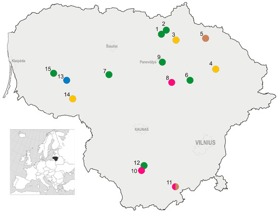 Location of the study sites in Lithuania: 1—Aukštikalniai, 2—Pajiešmeniai, 3—Gaižiūnai, 4—Užpaliai, 5—Kalpokai, 6—Šeimyniškiai, 7—Šedbarai, 8—Šiekštinės, 9—Dembava, 10—Užubaliai, 11—Barčiai, 12—Luksnėnai, 13—Naujasis Obelynas, 14—Gaurė, 15—Kvėdarna. Crop type is indicated by color: green—apple orchards, brown—plum orchards, magenta—raspberry plantations, yellow—currant plantations, and blue—highbush blueberry plantations. Location coordinates are not presented to ensure privacy of the owners.