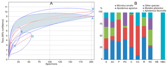 Small mammal species accumulation curves (A): A—control, B—apple orchards, C—plum orchards, D—currant plantations, E—raspberry plantations, and share of the dominant species in the control habitats and commercial fruit farms in Lithuania, 2018 (B): A—apple orchards, AC—apple orchard controls, P—plum orchards, PC—plum orchard controls, C—currant plantations, CC—currant plantation controls, R—raspberry plantations, RC—raspberry plantation controls, HB—highbush blueberry plantations, HBC—highbush blueberry plantation controls.