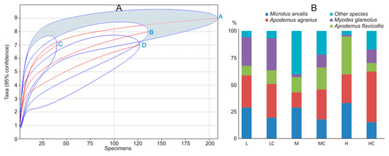 Small mammal species accumulation curves (A): A—control, B—low, C—medium, D—high intensity, and share of the dominant species in the control habitats and commercial fruit farms according to the intensity of agricultural practices (B): L—low intensity, LC—low-intensity controls, M—medium intensity, MC—medium-intensity controls, H—high intensity, HC—high-intensity controls.