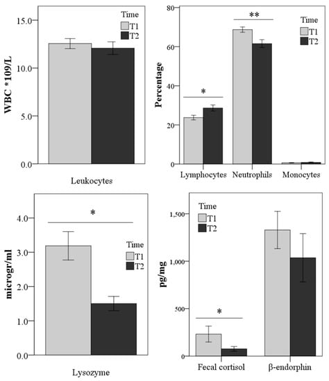 From the above, the reduction of lysozyme found after the acclimatization period could reflect an adaptive physiological response expression of an improvement in the general welfare. Finally, the lack of correlation between cortisol and lysozyme, as well as with all other parameters, could be also due to the fact that they were measured in different matrices, feces, and blood, reflecting the physiological response in a temporally disconnected way. Overall, these findings support that lysozyme plays a role in stress response, but partially disconfirm results of previous studies [,]. Therefore, further investigation in dogs is needed.
