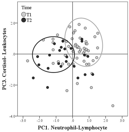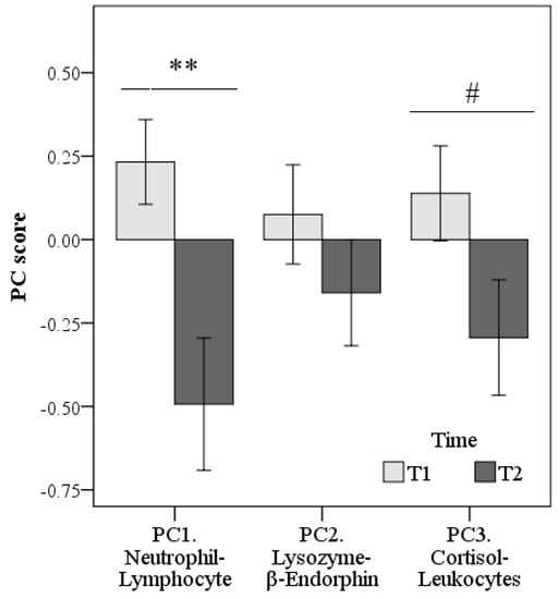 As highlighted by the score plot (Figure 2) and by the average PC scores on the bar graph (Figure 3), PC1.Neutrophil-Lymphocyte (p < 0.01) and PC3.Cortisol-Leukocytes (as trend, p = 0.071) decreased from the T1 to T2 sampling, while there were no significant differences for PC2.Lysozyme-β-Endorphin over time.