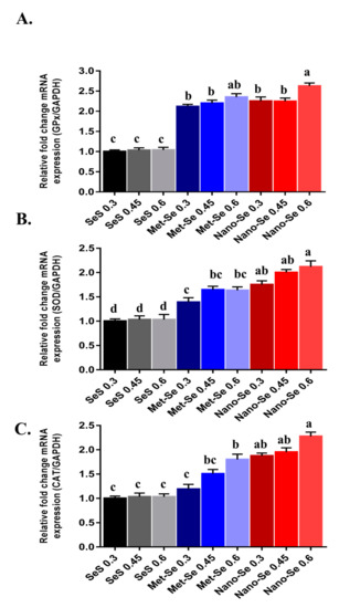 Effects of dietary Se source and level on the relative antioxidant enzymes expression (A–C). (A) Glutathione peroxidase (GPx); (B) super oxide dismutase (SOD); and (C) catalase (CAT) in the liver of broiler chickens at 40 days. SeS = sodium selenite, Met-Se = selenomethionine, nano-Se = nano-selenium. a,b,c,d Different superscript letters denote significant difference (p < 0.05). Values are means ± standard error.