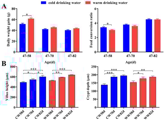 The balance of gut microbial composition is critical for host physiology, and disruption to its composition has been associated with metabolic disorders and gastrointestinal diseases, such as obesity and inflammatory bowel diseases (IBD), encompassing ulcerative colitis (UC) and Crohn’s disease (CD) [,]. Recent studies have indicated that cold temperature can change the composition and function of the gut microbiota [,]. In addition, cold temperature can also impede human health, especially in children who experience a greater risk of gastrointestinal diseases, such as diarrhea, under colder conditions [,]. Similar effects have been reported in early postweaning livestock, who suffer from both cold stress and weaning stress during winter, leading to higher mortality and risk of diarrhea, lower growth rates, and increased economic losses in farmed animals [,]. Previous studies have revealed that low-temperature environments and weaning stress impaired intestinal mucosal immunity, barrier function, and the homeostasis of cecal microflora [,,]. One of the major contributors to these effects is that the deprivation of the mother’s milk after weaning causes weaned animals to lose the passive gut immunity provided by antibodies in breast milk []. At the same time, the weaned animals switch from warm breast milk to cold water, and their intestinal health is affected by stress from both the diet change and low temperature []. A previous study indicated that optimal gut microbiota can maintain intestinal health and then promote the production performance of animals []. Interestingly, drinking warm water or warm milk replacers has been found to have a beneficial effect on the growth performance of animals during winter [,]. However, it is not clear whether drinking WW promotes gut health by altering gut microbes.