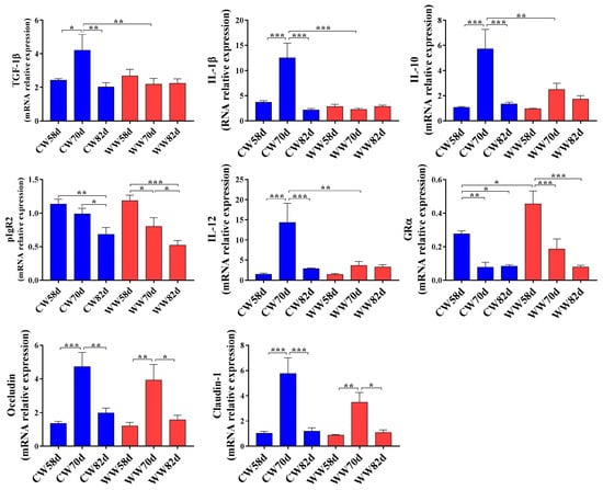 The effects of drinking WW on cytokine and tight junction-associated gene expression in the jejunum are shown in Figure 2. The expression of TGF-1β, IL-1β, IL-10, and IL-12 was significantly reduced in the WW group compared to those of the CW group at day 70. However, the expression of these genes was not significantly different between the WW and CW groups at days 58 and 82. Similarly, we analyzed the expression of Occludin and Claudin-1 related to the intestinal barrier in the jejunum with no significant differences observed between the WW and CW groups at days 58, 70, and 82. Furthermore, glucocorticoids exhibit anti-inflammatory activity through glucocorticoid receptors, and the expression of glucocorticoid hormone receptor alpha (GRα) in jejunum tissues from WW rabbits was significantly higher than that of CW rabbits at day 58. In addition, pIgR2 is associated with innate and adaptive immunity, which increases in response to bacterial or viral infections. With increasing age, the expression of pIgR2 and GRα in the jejunum were significantly decreased in both groups.