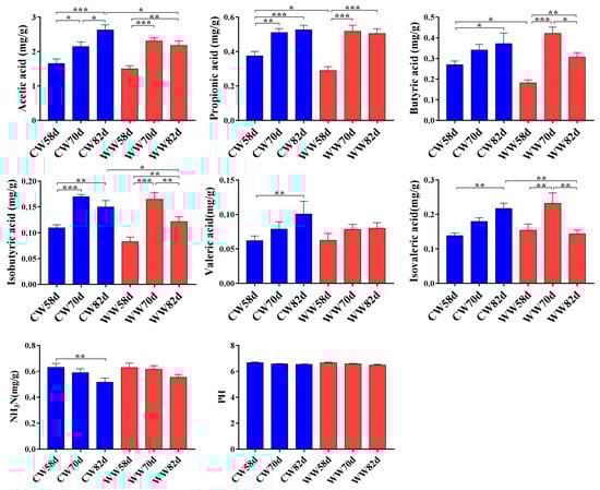 Effects of drinking warm water on short-chain fatty acids (SCFAs) concentration, NH3-N concentration, and pH values of rabbits (n = 8). CW, cold water group; WW, warm water group. * p < 0.05, ** p < 0.01, *** p < 0.001. Values are shown as means ± SEM. Differences were analyzed by one-way analysis of variance followed by the least-significant difference post hoc test.